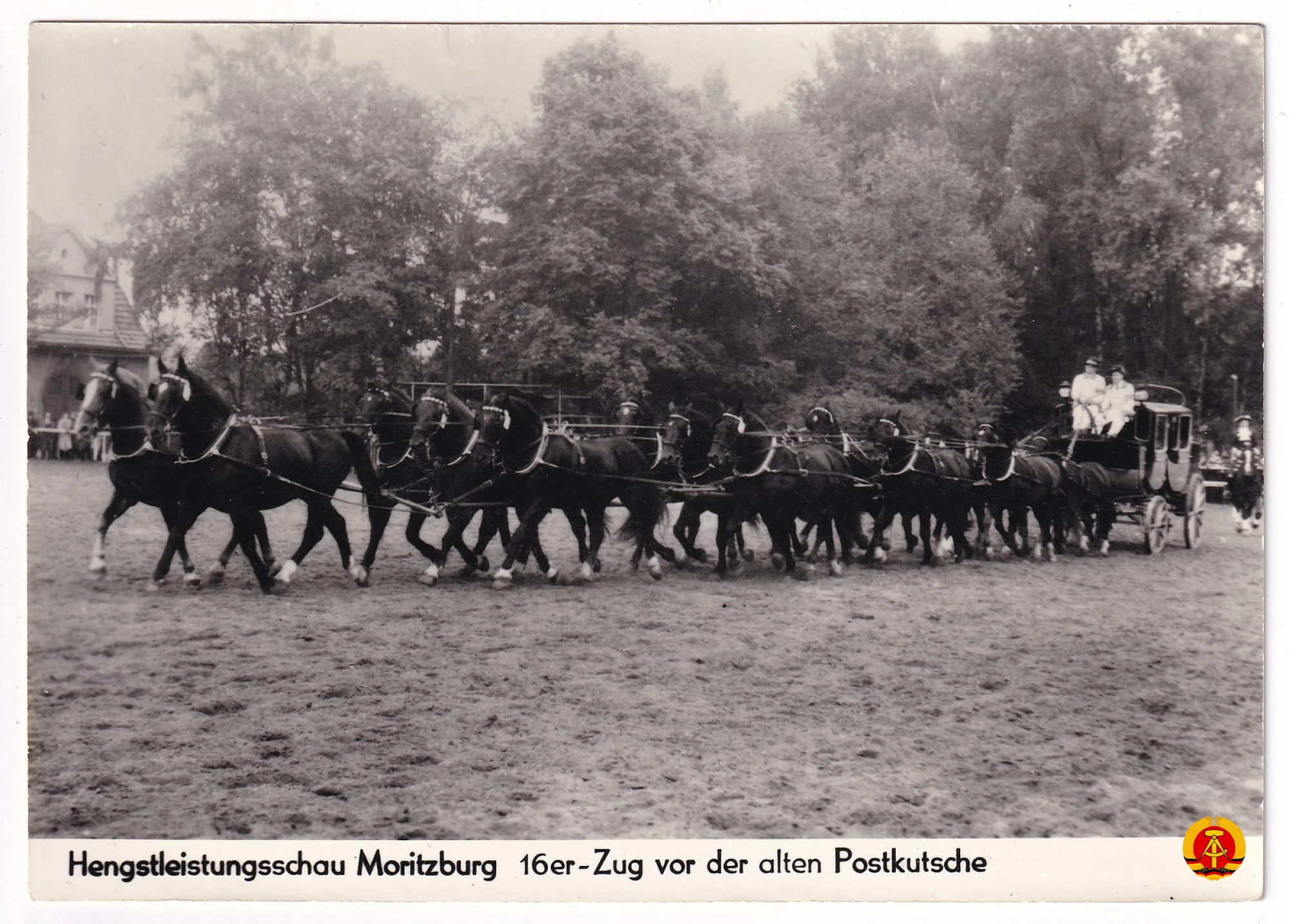 Hengstleistungsschau Moritzburg – 16er-Zug vor der alten Postkutsche - 1973